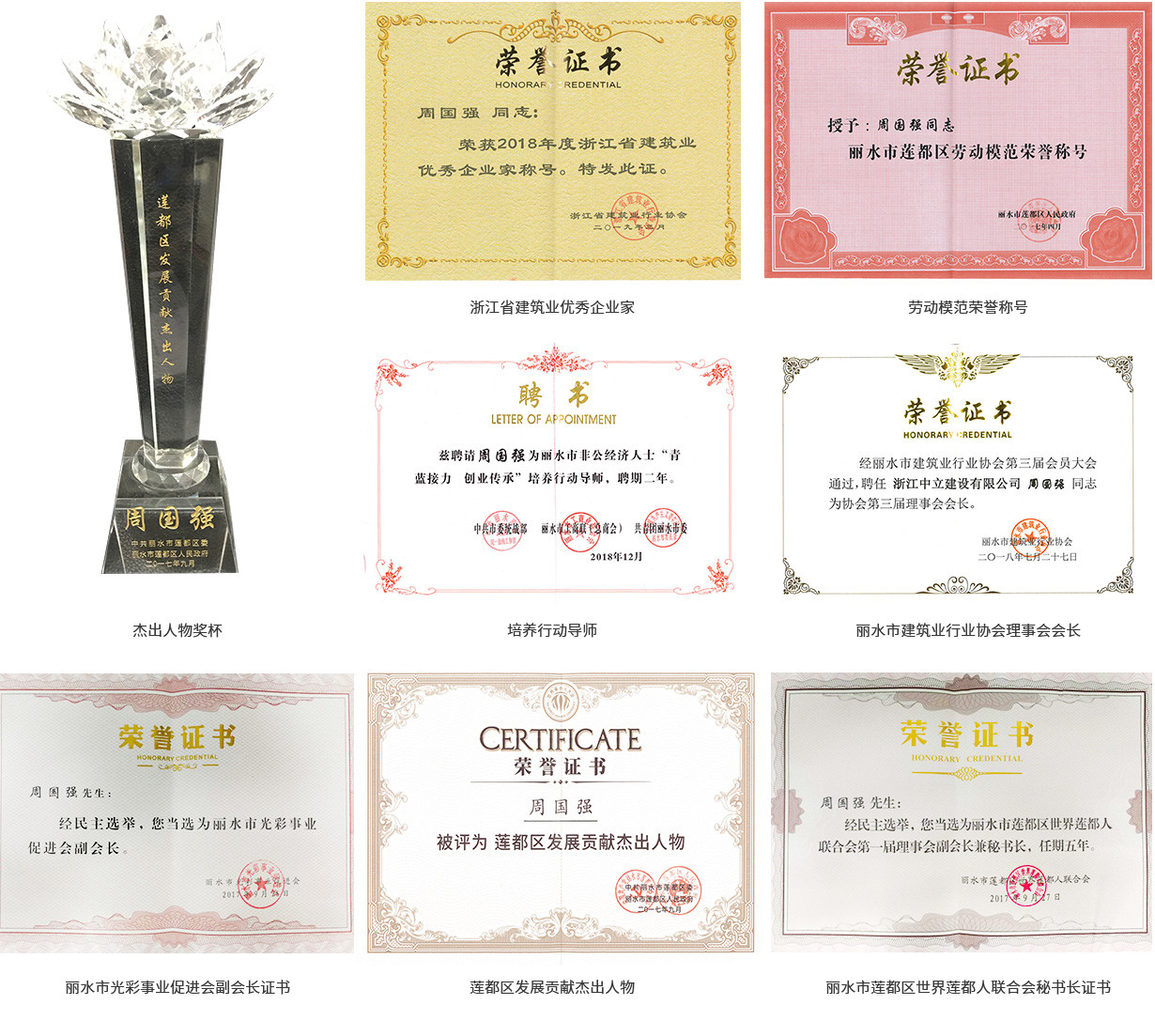 2018年7月當(dāng)選為麗水市建筑業(yè)行業(yè)協(xié)會(huì)理事會(huì)會(huì)長(zhǎng),2019年3月被浙江省建筑業(yè)行業(yè)協(xié)會(huì)評(píng)為2018年度浙江省建筑業(yè)優(yōu)秀企業(yè)家。