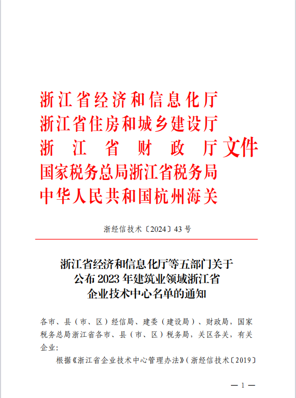 近日,浙江省經濟和信息化廳等五部門公布2023年建筑業領域浙江省企業技術中心名單的通知,我公司企業技術中心榮獲2023 年建筑業領域浙江省企業技術中心認定。